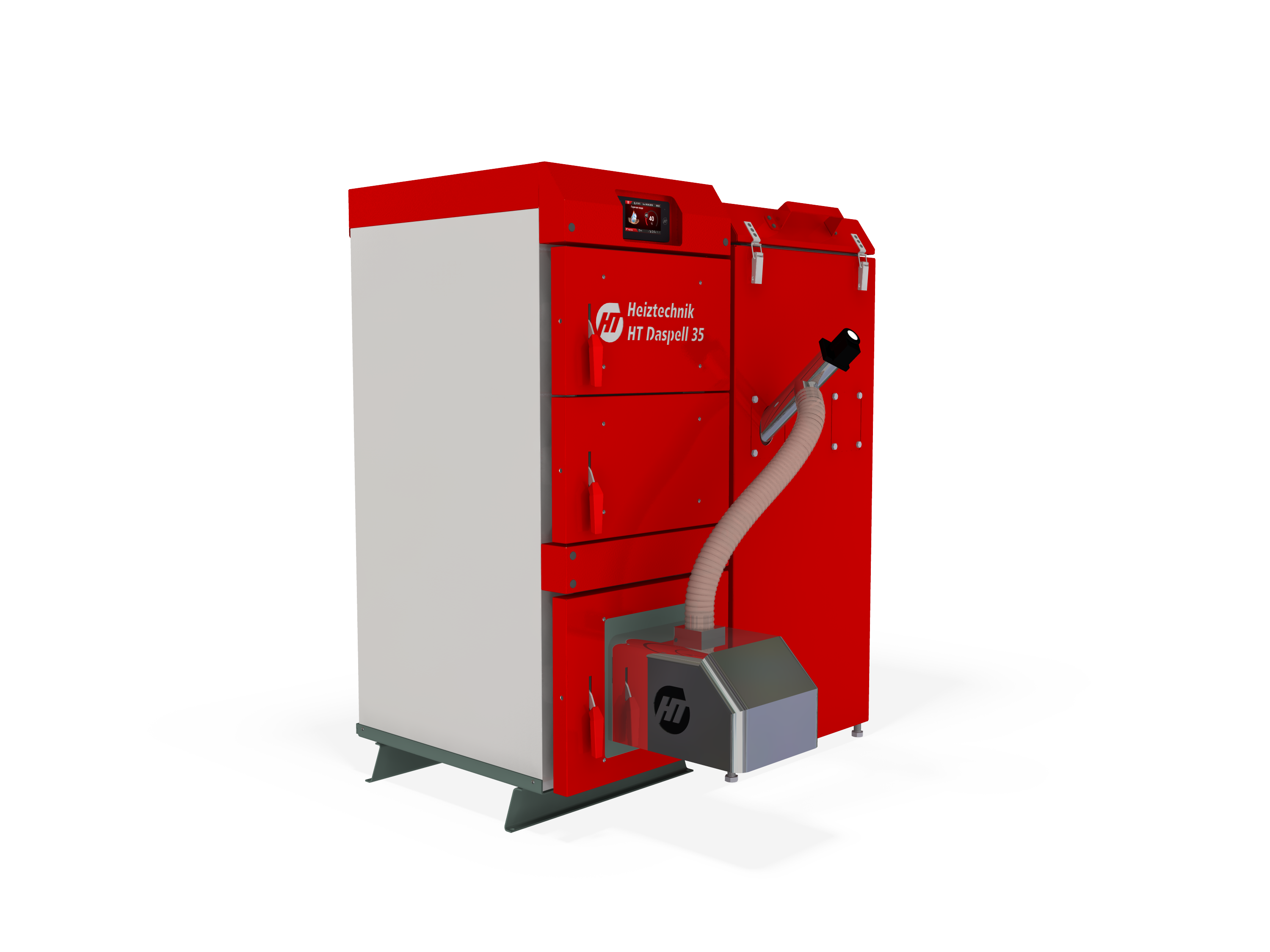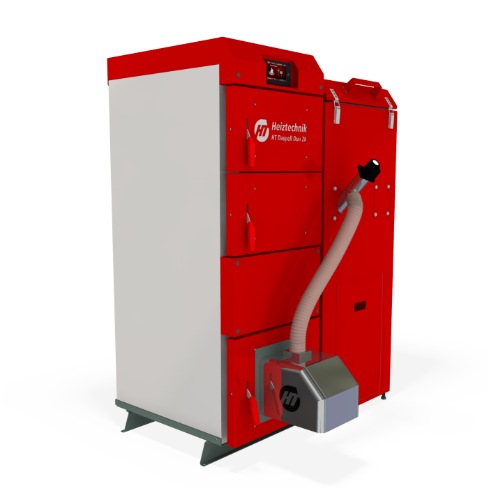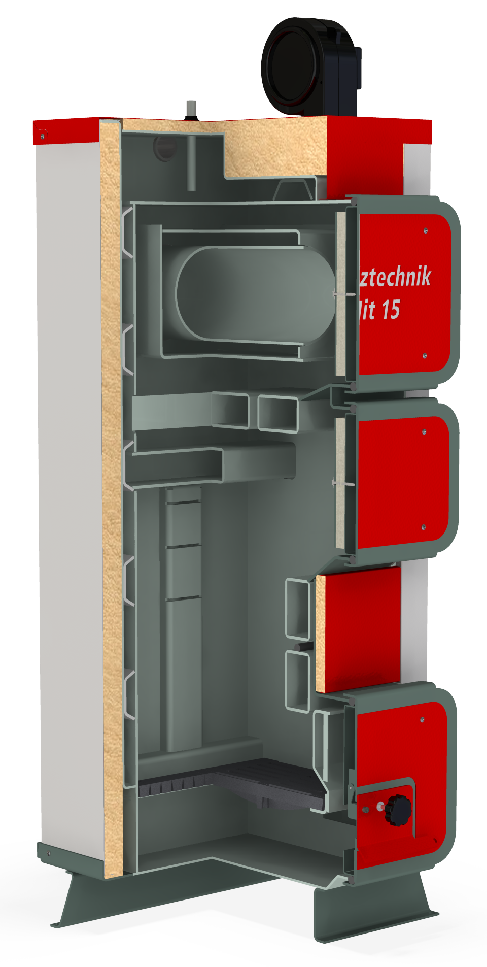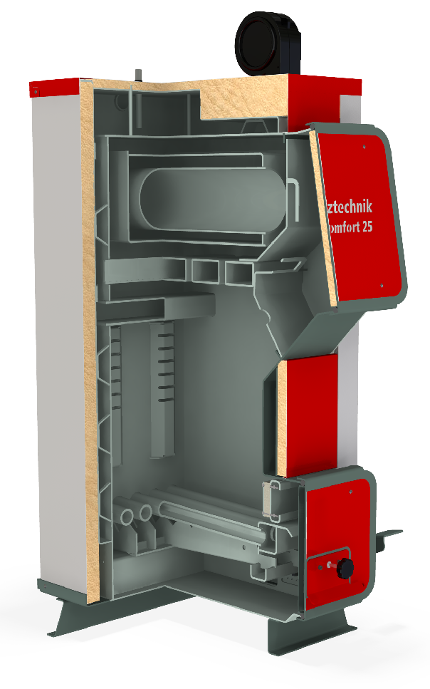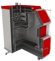 Топливо автоматически подаётся в зону горения (уголь, пеллеты, опилки+уголь).